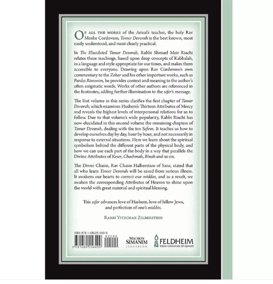 In The Elucidated Tomer Devorah, Rabbi Shmuel Meir Riachi relates these teachings, based upon deep concepts of Kabbalah, in a language and style appropriate for our times, and makes them accessible to everyone. Drawing upon Rav Cordovero’s own commentary to the Zohar and his other important works, such as Pardes Rimonim, he provides context and meaning to the author’s often enigmatic words. Works of other authors are referenced in the footnotes, adding further illumination to the sefer’s message.