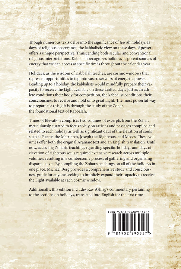 Explore the Kabbalistic interpretation of significant holidays with Times of Elevation. The first of a two-volume set, curated by renowned author and Kabbalah scholar Michael Berg, this seminal work offers meticulously selected excerpts from the Zohar focusing on holidays and days of elevation for righteous souls. Each volume provides the original Aramaic text alongside English translations, as well as Master Kabbalist Rav Ashlag’s commentary, translated into English for the first time. By compiling the Zohar’s teachings on all of these powerful days in one place, Times of Elevation serves as a comprehensive guide for anyone looking to expand their capacity to access and harness the energetic power of these cosmic windows.